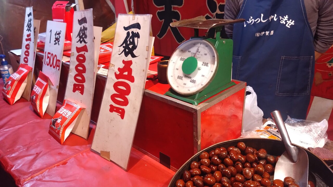 天津甘栗の屋台で活躍中の「みどりのハカリ」です。